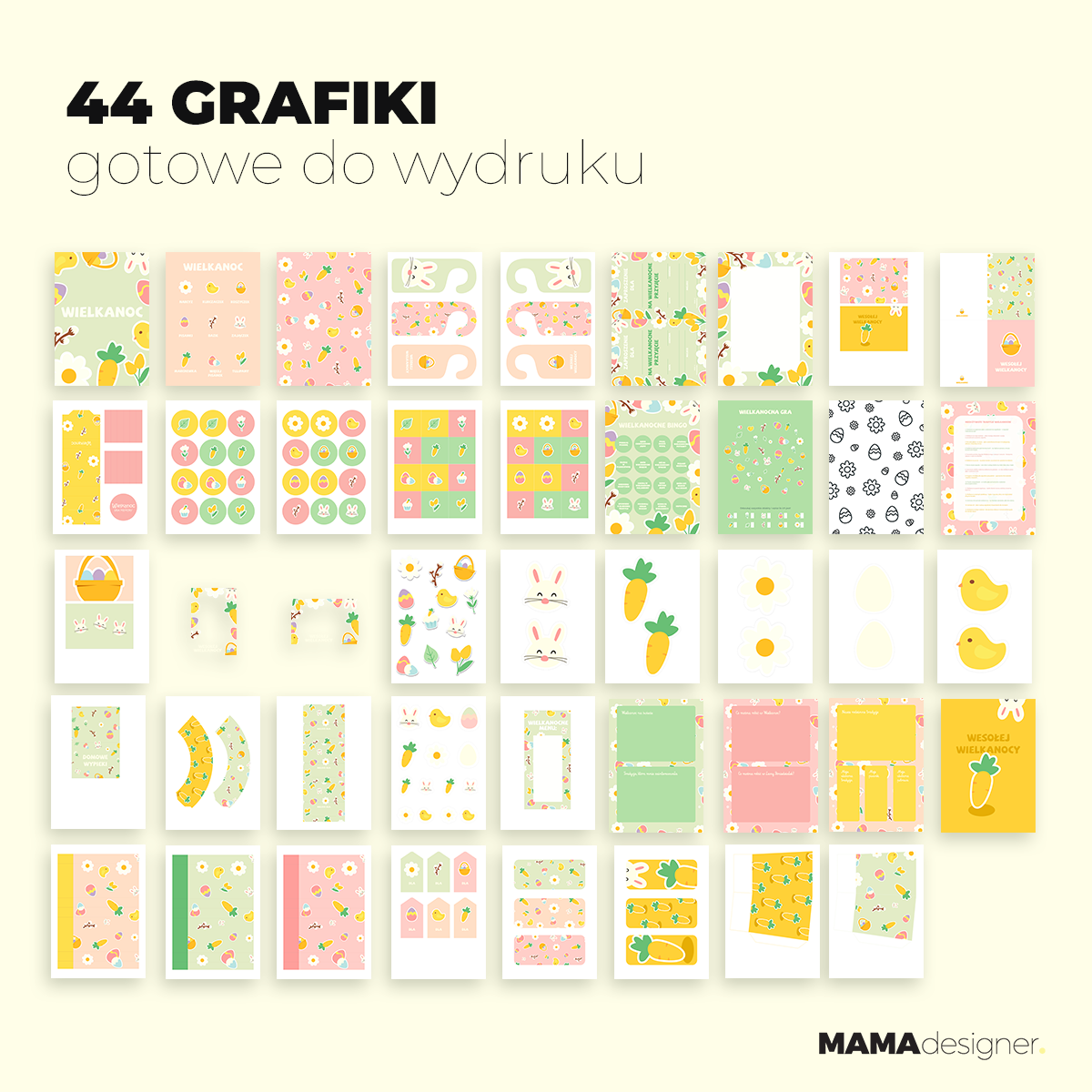 Przygotuj niezapomniane przyjęcie wielkanocne z gotowym zestawem 44 uroczych grafik do druku! Dekoracje, gry, etykiety i dodatki w pastelowych kolorach – idealne na rodzinny stół i zabawy z dziećmi.